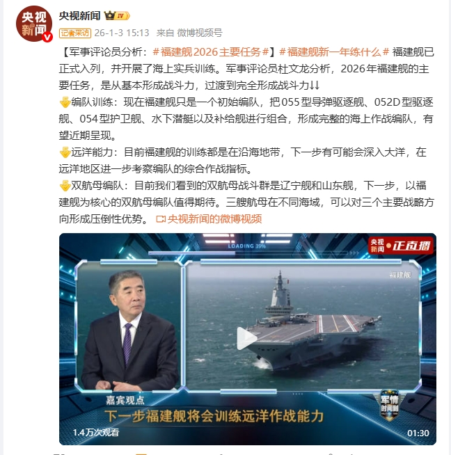 据@央视新闻消息,福建舰已正式入列,并开展了海上实兵训练。军事评论员杜文龙分析,2026年福建舰的主要任务,是从基本形成战斗力,过渡到完全形成战斗力↓↓